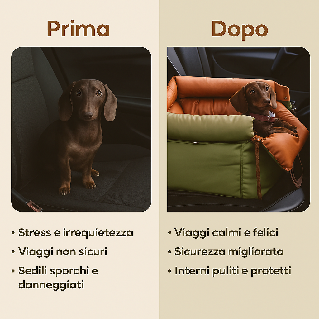 Crafted from high-quality technical eco-leather, it is waterproof, stain-resistant, and easy to clean — perfect for daily use or adventurous journeys. The non-slip base, adjustable internal leash, and reinforced edges keep your dog safe even on bumpy roads. Easy to install and carry, thanks to the integrated handle and handy side pockets for accessories.